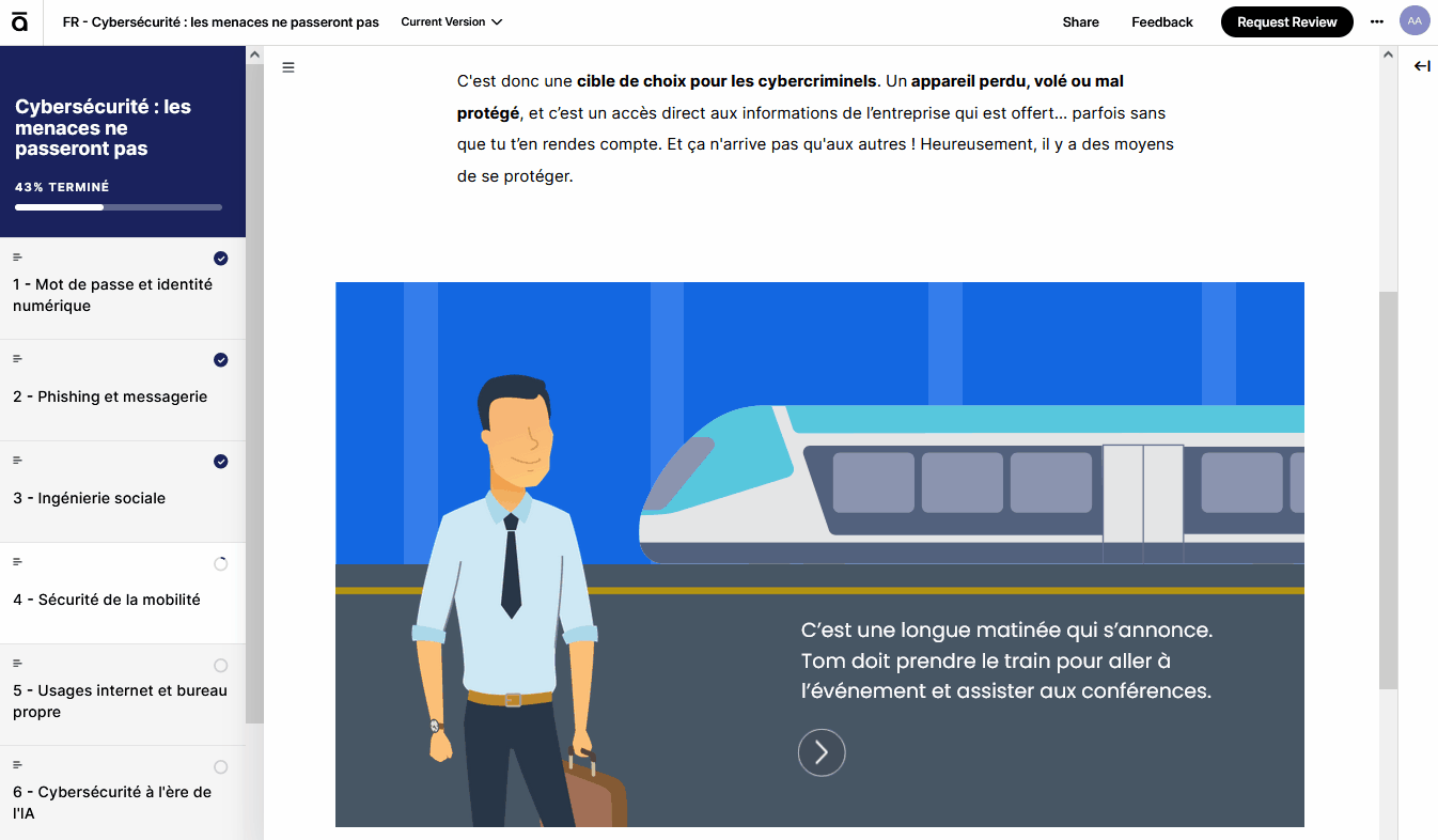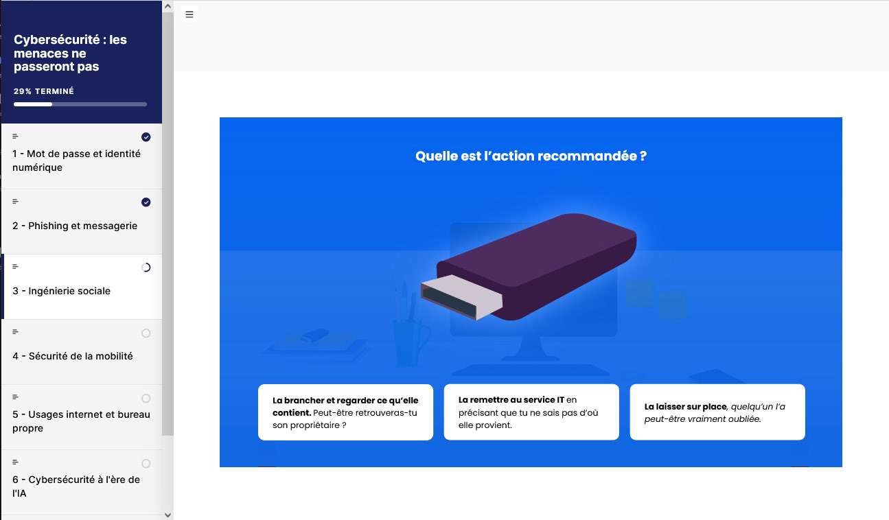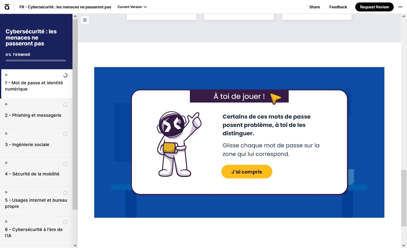 Dans le cadre de mon alternance chez EPSA, j’ai conçu et produit de A à Z un module de formation obligatoire en cybersécurité, à l’aide de Rise et Storyline, en travaillant le design sur Illustrator.