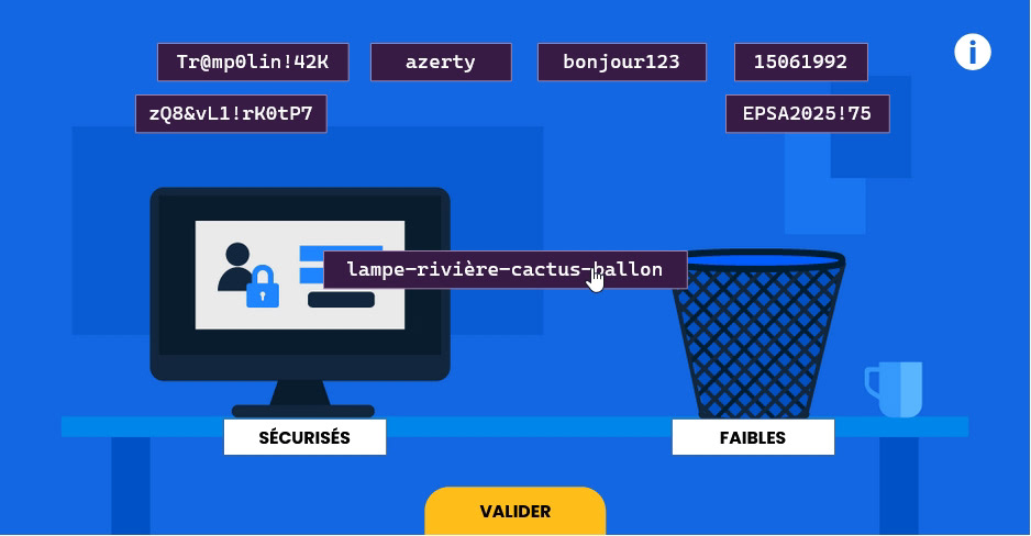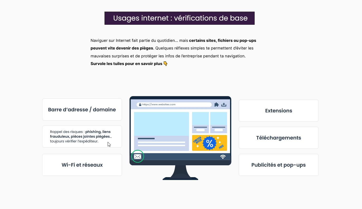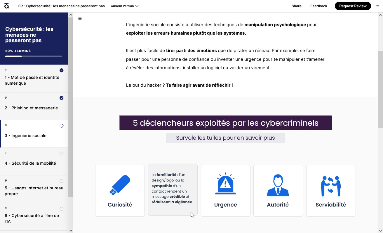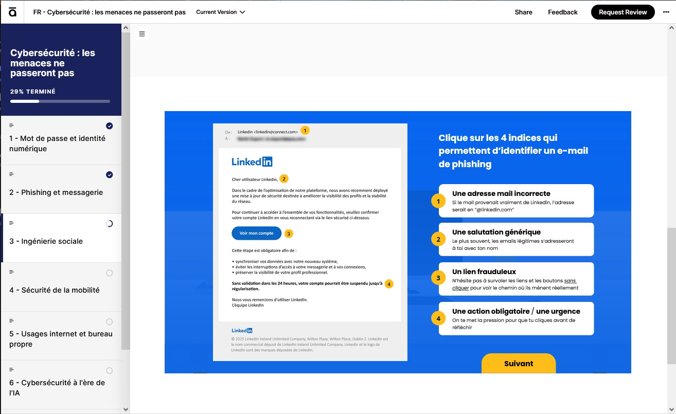 Dans le cadre de mon alternance chez EPSA, j’ai conçu et produit de A à Z un module de formation obligatoire en cybersécurité, à l’aide de Rise et Storyline, en travaillant le design sur Illustrator.